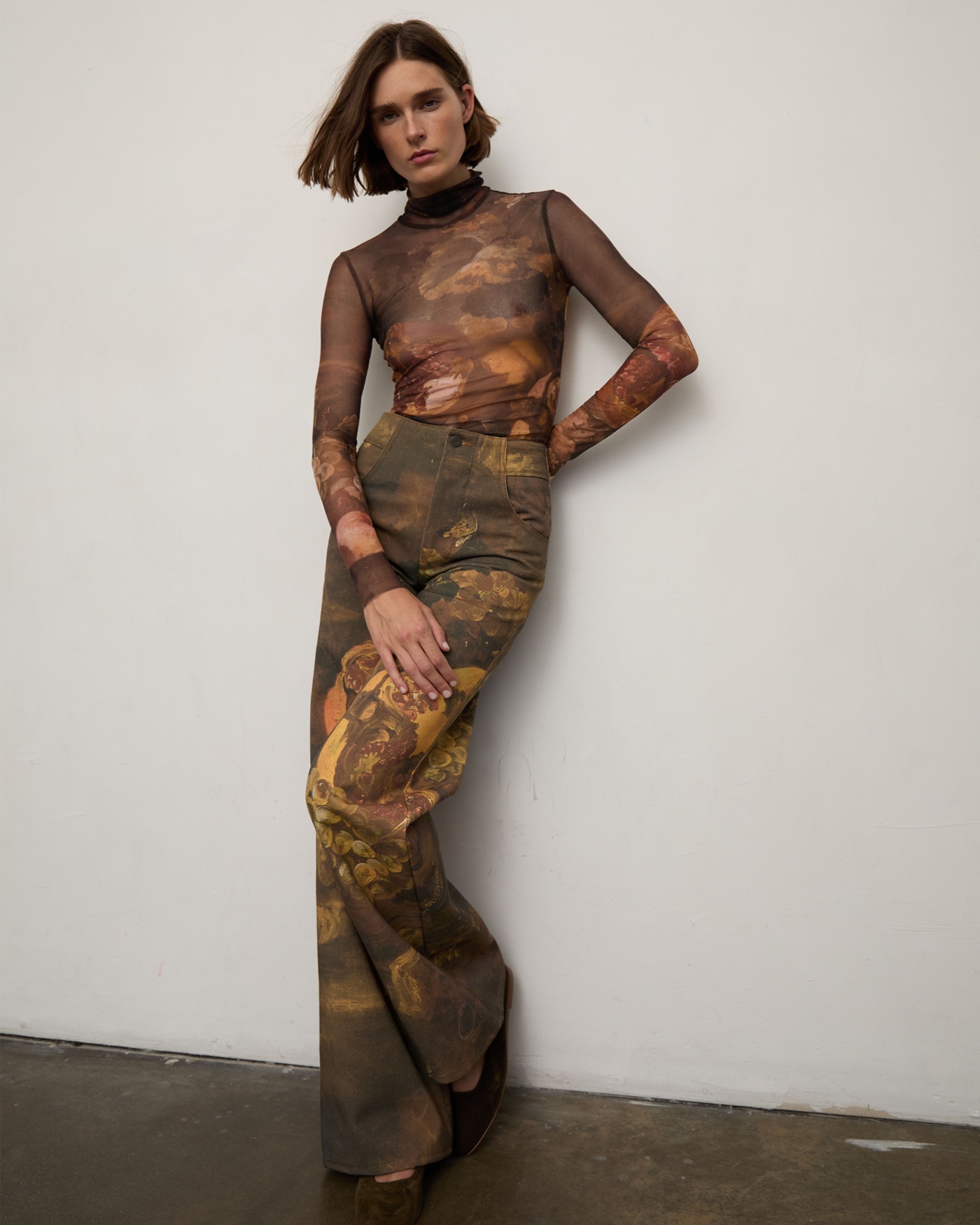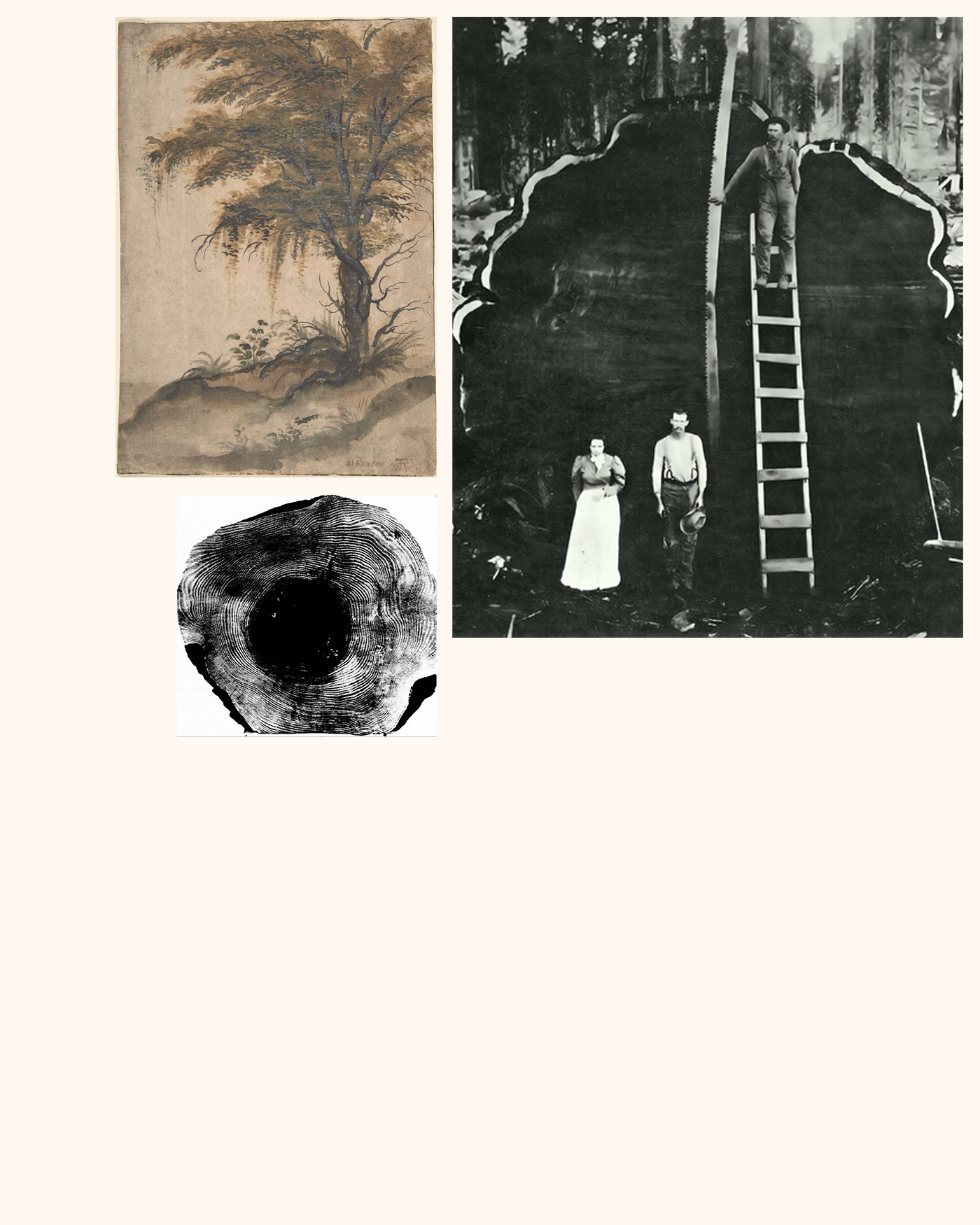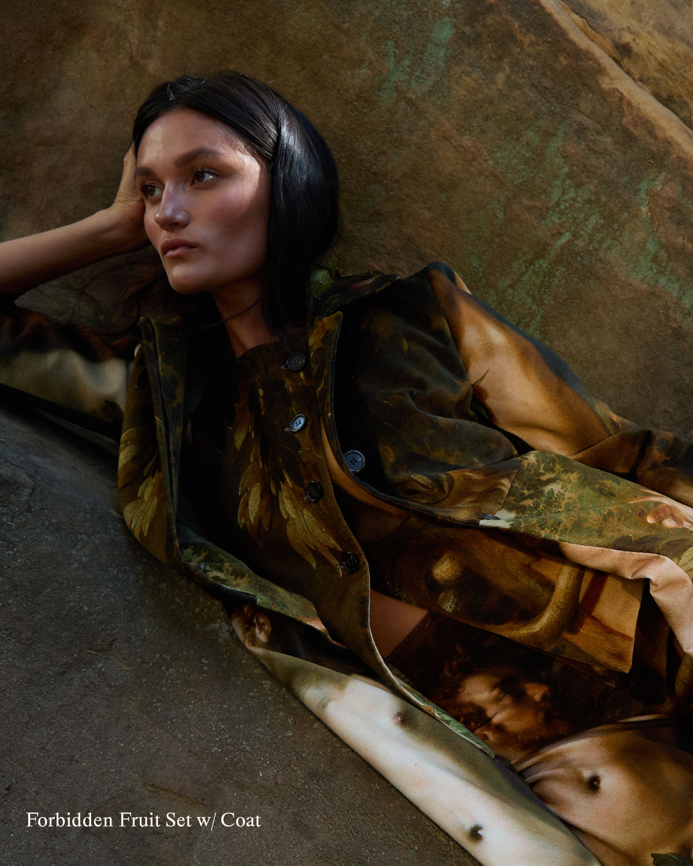 Through the use of prints, each piece is intended to be wearable art that sparks conversation. The imagery featured includes historical etchings and oil paintings, vintage photographs, and Falling Leaves, 2008 artwork by renowned British artist Jonathan Yeo. These prints dive into the history of logging, the devastating reality of deforestation, and the environmental impact of forest fires.