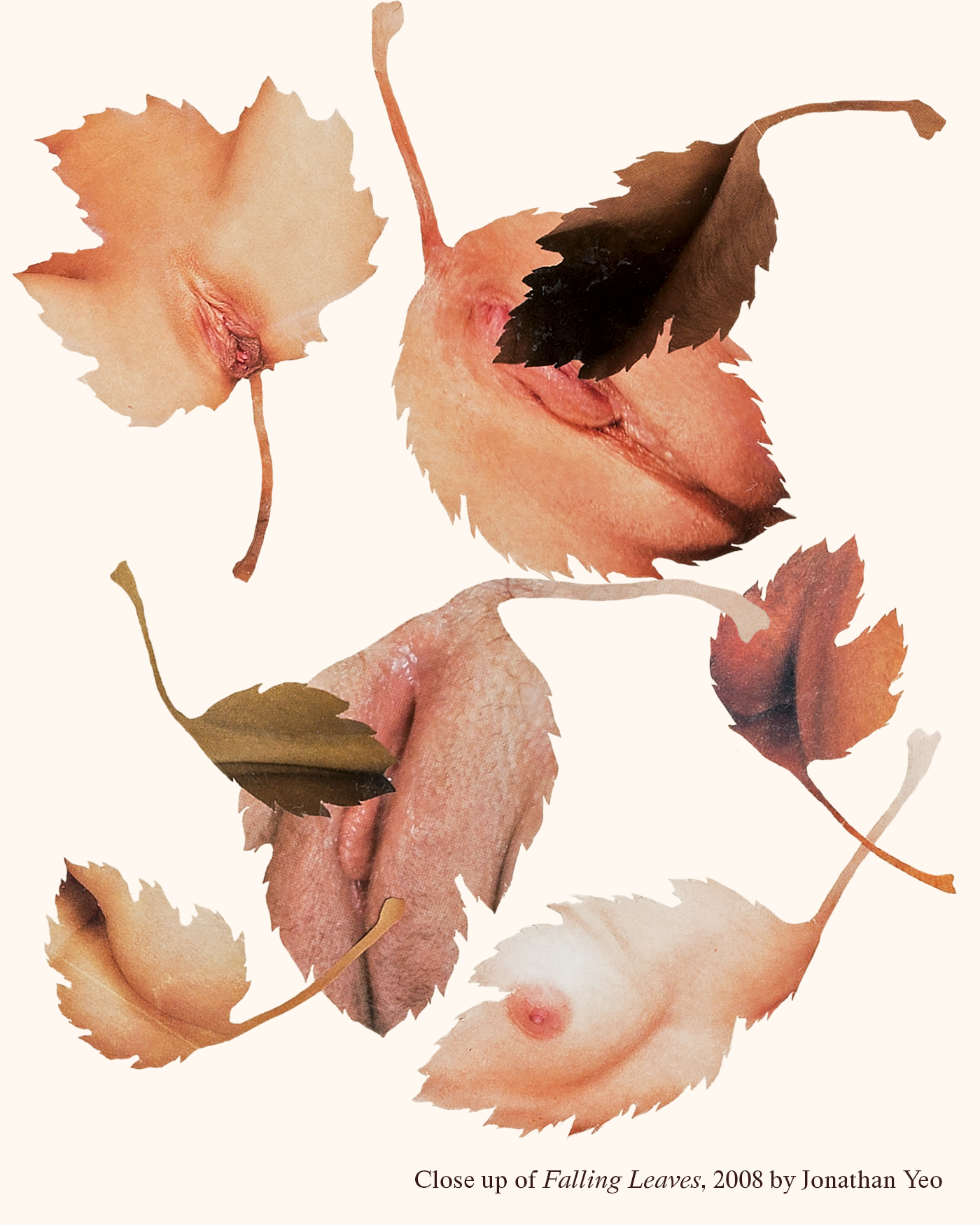 Jonathan Yeo, a celebrated figurative artist, has worked in a number of mediums including oil paint and collage. In his Falling Leaves series, female genitalia is cut up and collaged as seemingly innocuous leaves. Lizzie Grover Rad was drawn to Yeo’s provocative work, which confronts the deep-rooted association between femininity and nature.